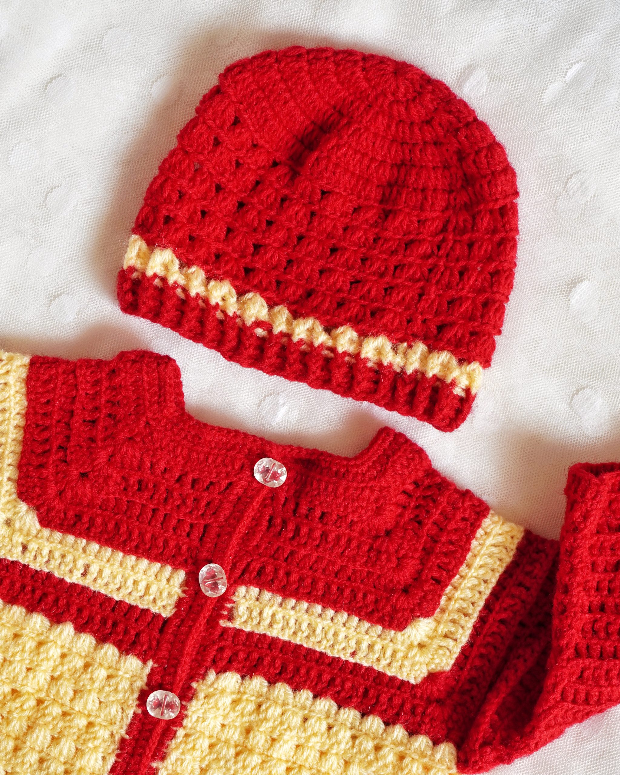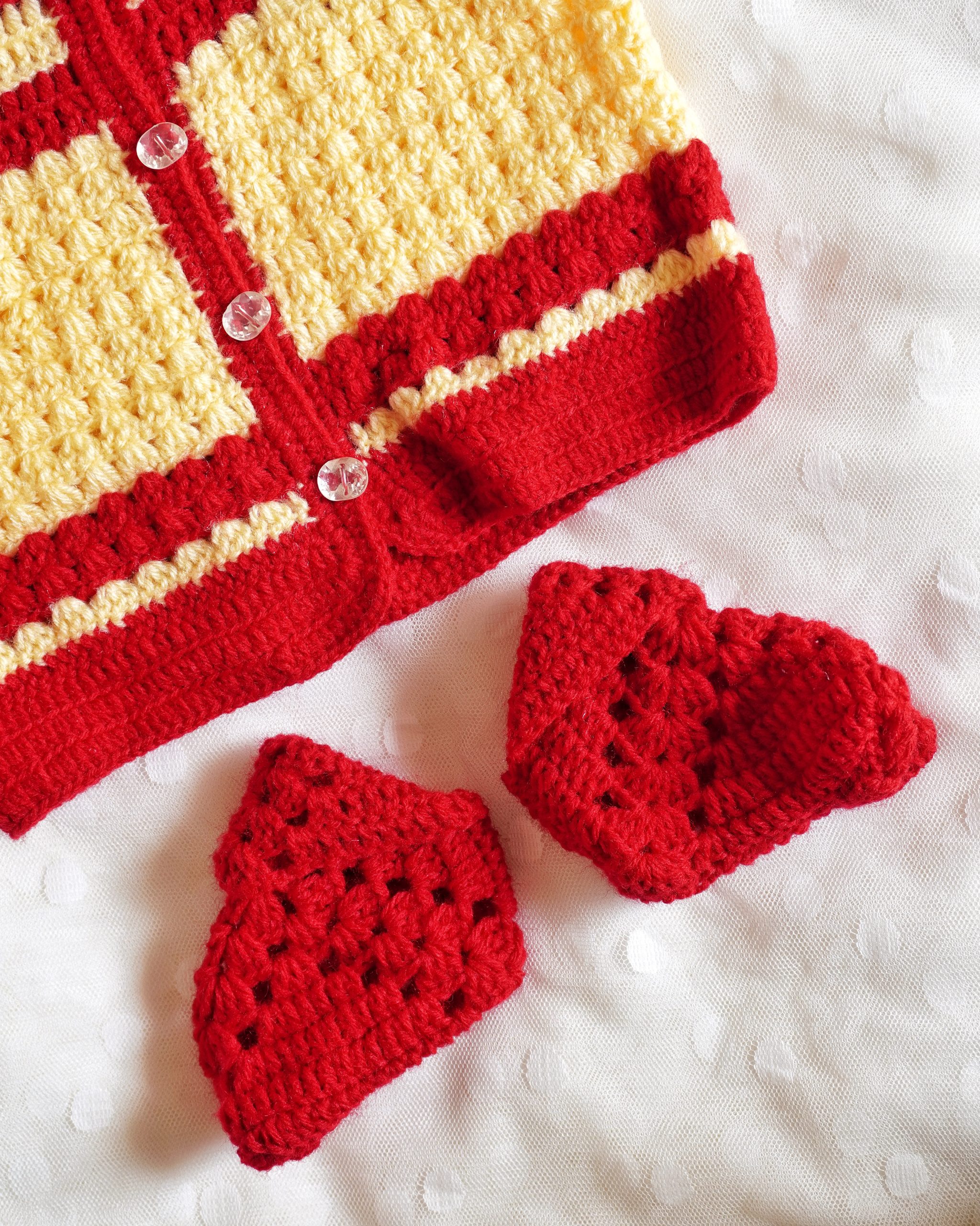 Red And Light Yellow Color Crochet woolen Baby Sweater Set