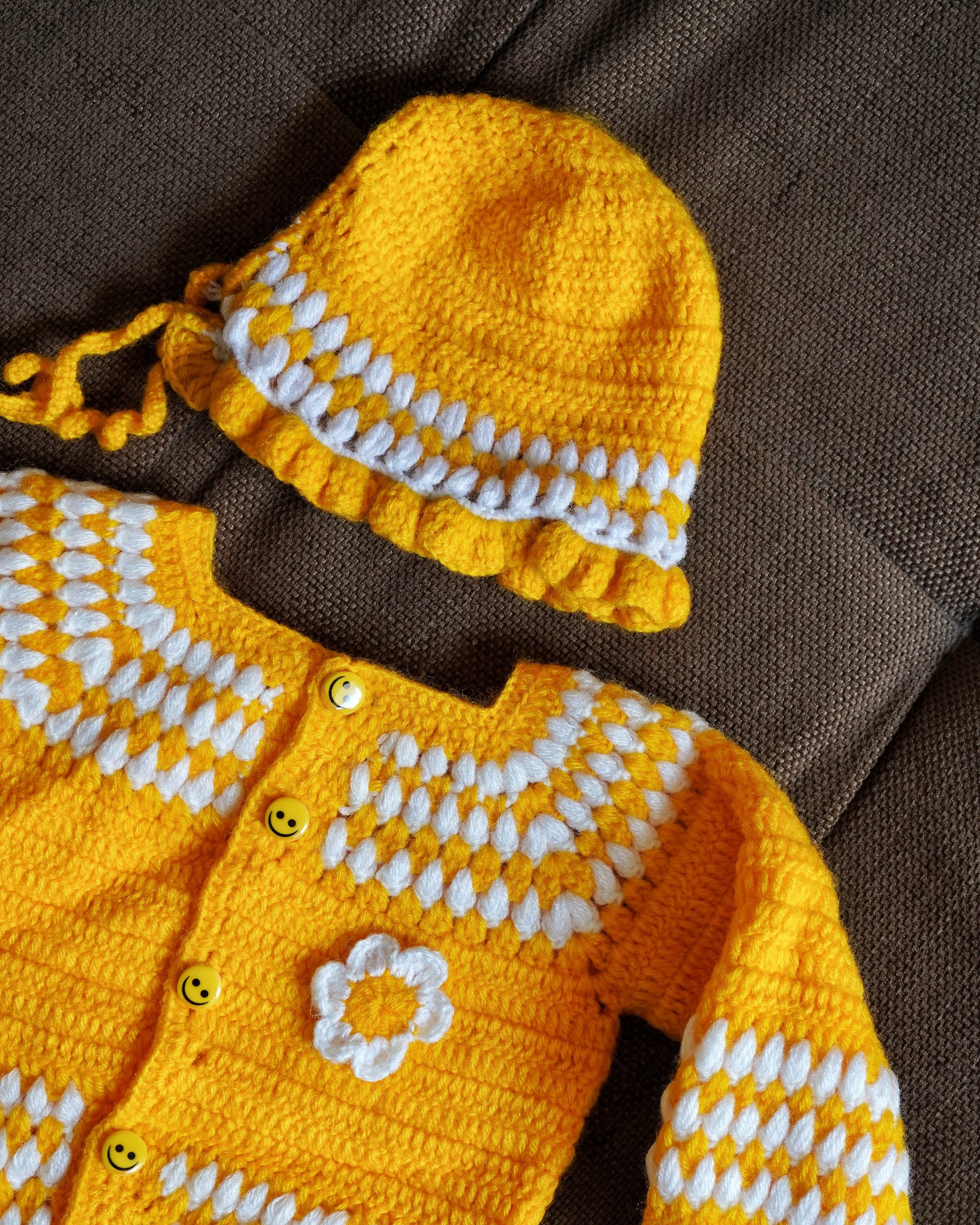 Yellow Color Handmade Crochet woolen Baby Sweater Set
